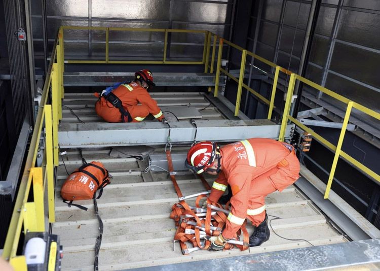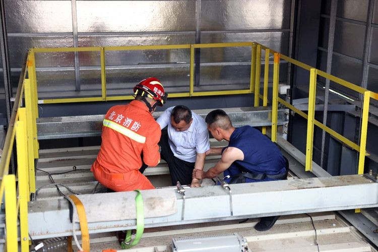 厂家技术人员联合消防员,打开层门、进入轿顶。